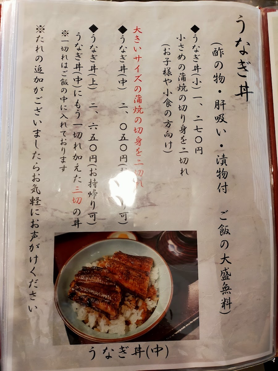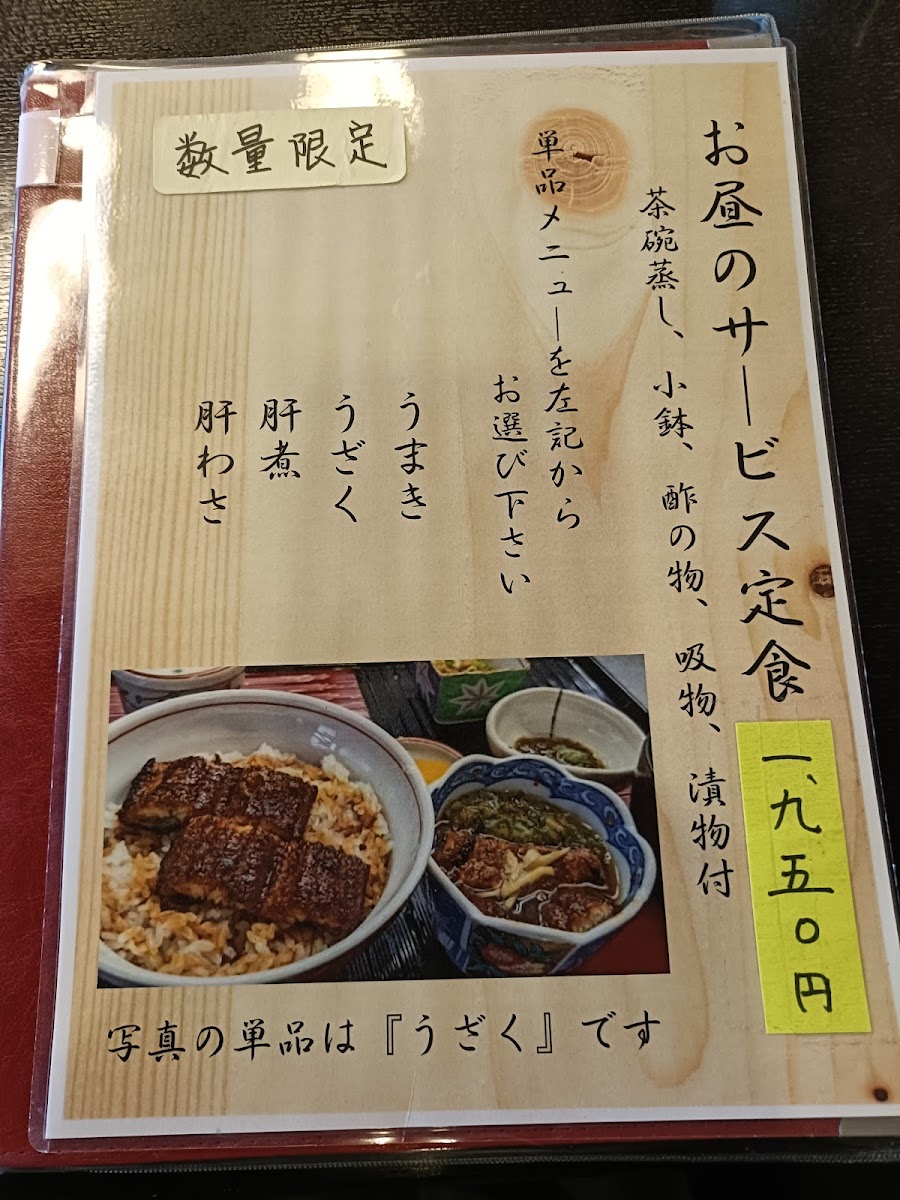 Service Set Meal: At ¥1950, this limited offering impresses with grilled unagi, a flavorful unagi roll, and steaming hot chawanmushi filled with tender eel, showcasing a mastery of flavors.